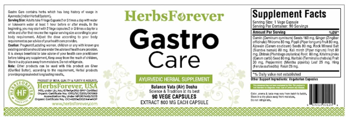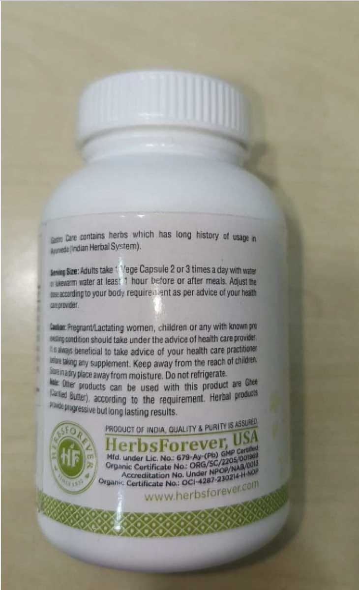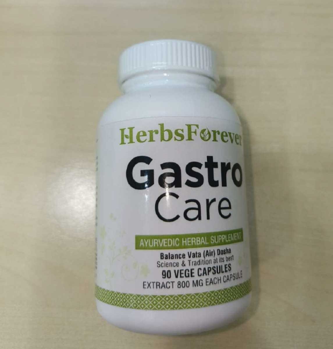 - HerbsForever brand Gastro Care, packaged in a white plastic bottle, 90 Veg. Capsules in each bottle 800 mg, with UPC: 807814001243, Batch Number 124-4, Expiry Date: January-2029.