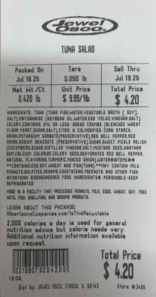 | TUNA SALAD | 21680700000 | Variable Weight | Jul 17 25 Thru Jul 19 25 | Jewel Osco | IL, IN, IA |