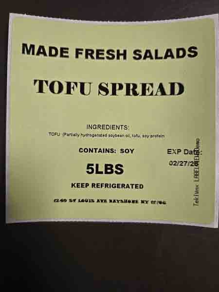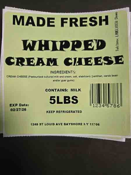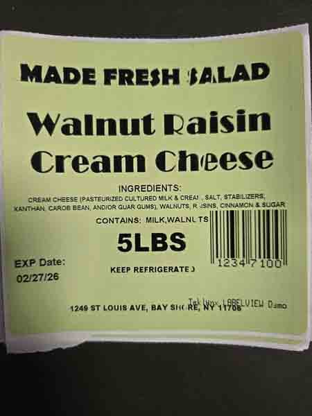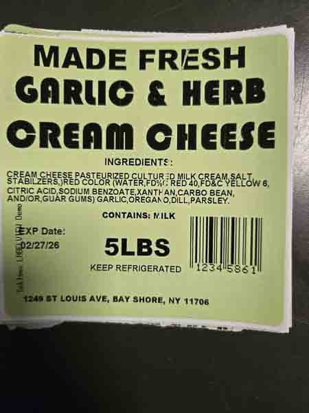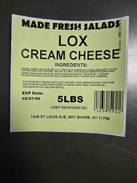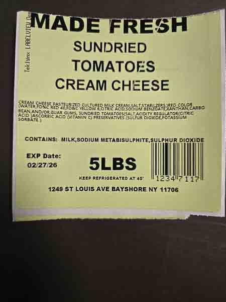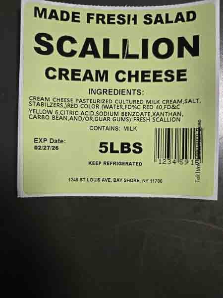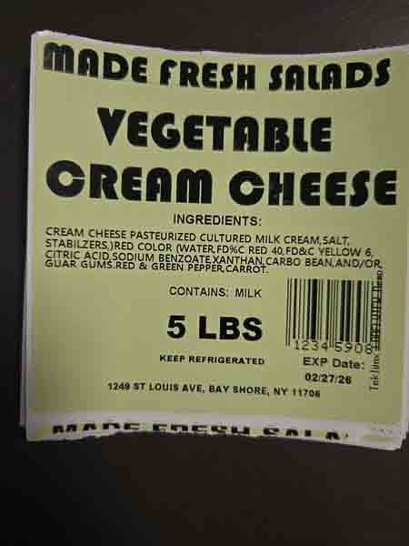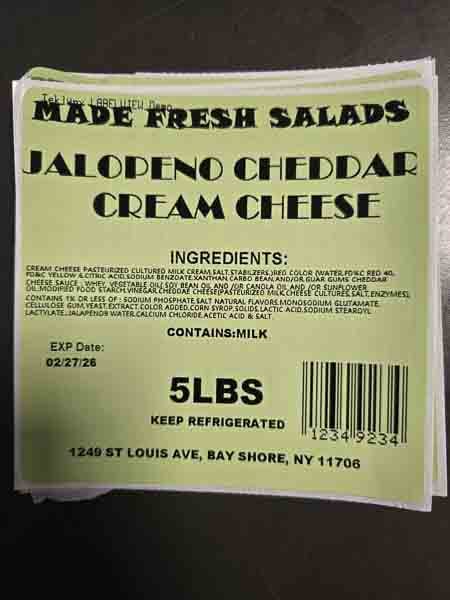 The cream cheese was distributed in Brooklyn, Queens, Bronx and New York City area by direct delivery to retail stores and distributors. Products are distributed in 5 lb. white plastic tubs with a Made Fresh Salads label. The flavors being recalled are as follows with expiration dates through February 27, 2026, marked in the bottom left corner of the label.