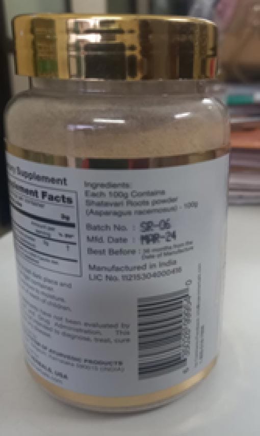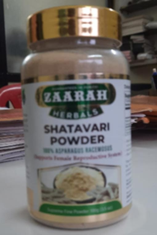 A: Zaarah Herbals Shatavari Powder is a dietary supplement packaged in clear 100g (3.5oz) jars with a gold lid.